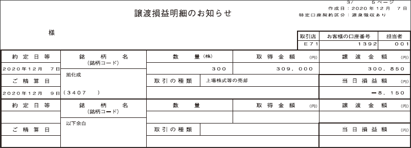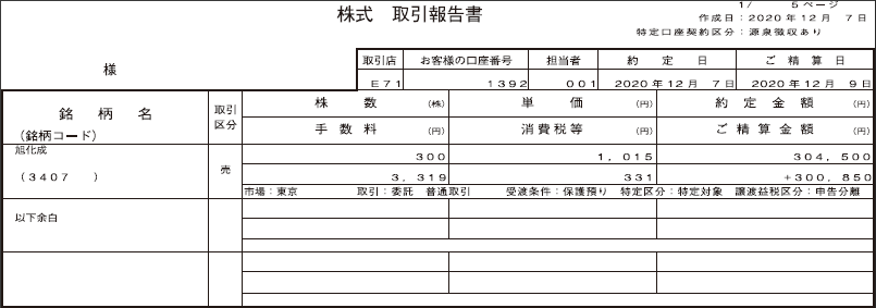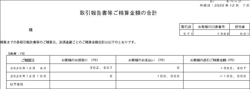 | 変更後 | 各種取引報告書類の書式を変更いたします。 「株式 取引報告書等」の新しい書式のサンプルを、「12.取引報告書の書式変更について」に記載しておりますので、併せてご確認ください。 |