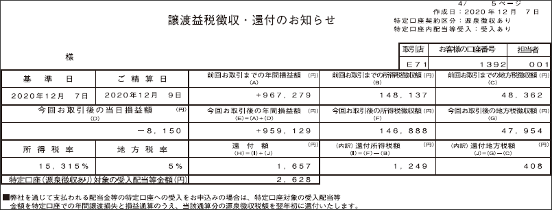 | 変更後 | 特定口座のご開設状況やお取引状況に応じて、「取引報告書」に加えて、新たに「譲渡損益明細のお知らせ」、「譲渡益税徴収・還付のお知らせ」、「取引報告書等ご精算金額の合計」を作成いたします。 |